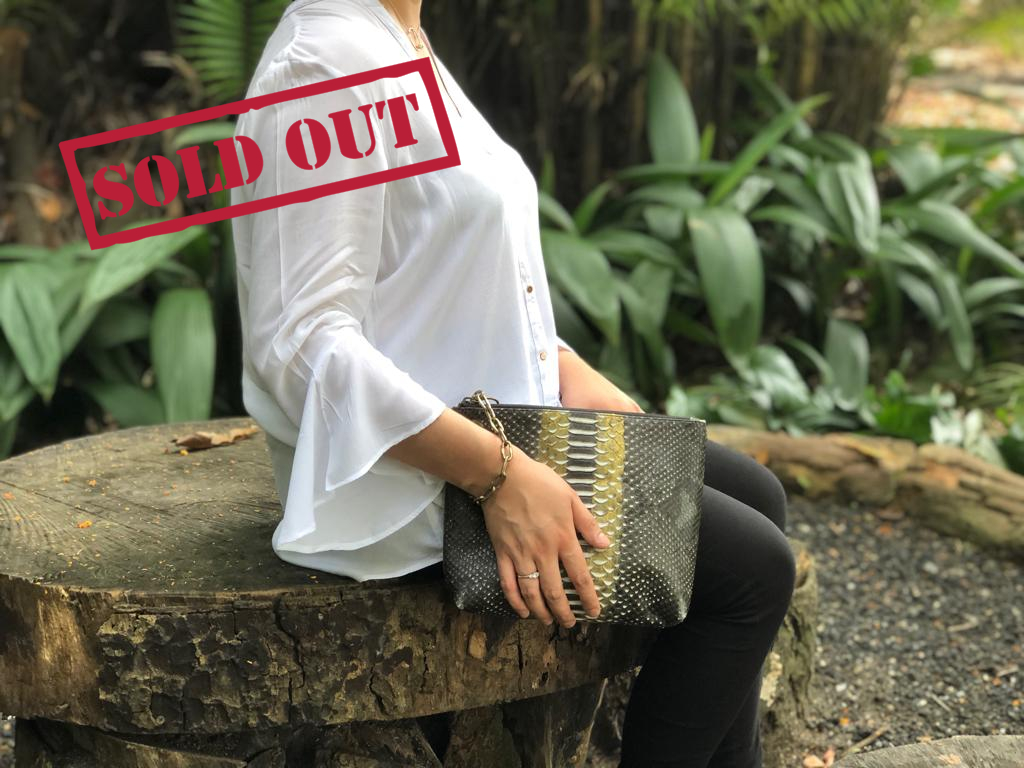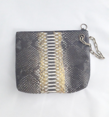 Pouch Bag made by Python Leather with chain in Black & Gold